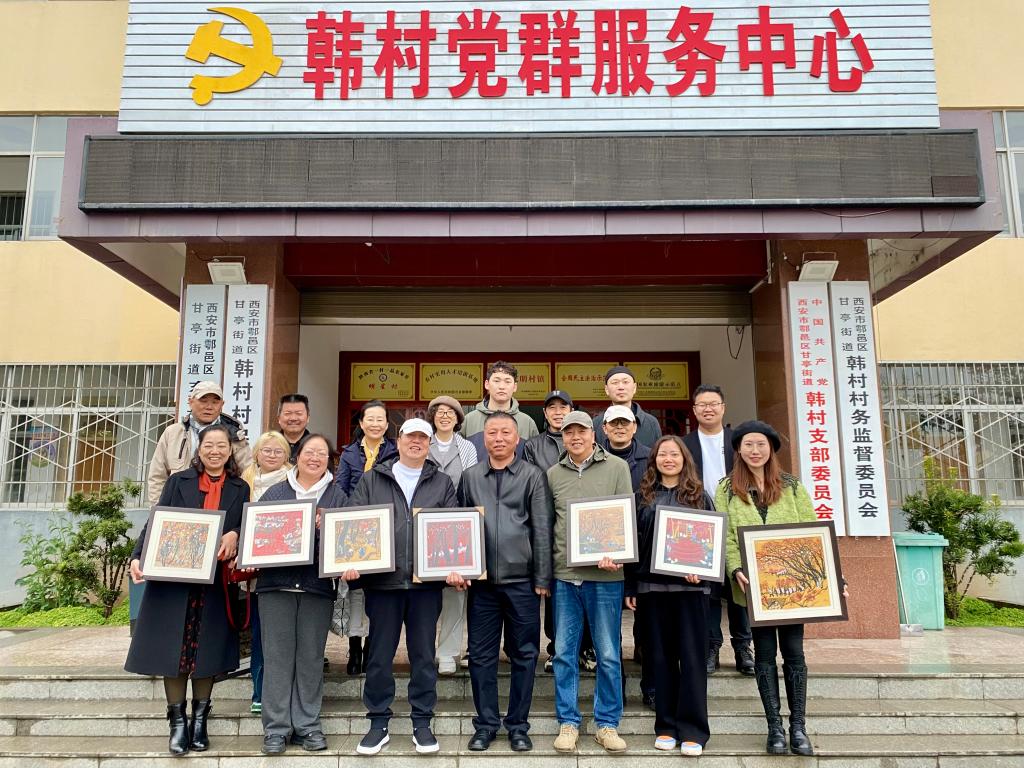 下午,在刘丹和赵雪伟的带领下,艺术公司调研团队来到户县农民画第一画村——东韩村进行乡村调研活动,并于党群服务中心召开座谈会议,与当地本土艺术家进行交谈。座谈会上,韩村党支部书记王登攀对艺术公司一行表示热烈欢迎,他介绍了农民画在东韩村的发展历程和东韩村在开展传统文化教育方面的优势,希望与公司达成更深层次的合作,推动传统文化教育发展,更好地担负起户县农民画的文化使命。刘丹代表公司向东韩村村委会对公司的欢迎表示感谢,他表示,为深入学习贯彻习近平总书记在文化传承发展座谈会上的重要讲话精神,公司要积极与鄠邑区农民画博物馆合作,共建传统文化教育实践基地。赵雪伟表示,希望通过此次调研考察,为公司师生日后的实践活动引领方向,引导员工增强文化自觉、坚定文化自信,传承和弘扬中华优秀传统文化。随后,艺术公司调研团队来到乡村振兴东韩研习所进行学习,并参观了东韩农民画庄。