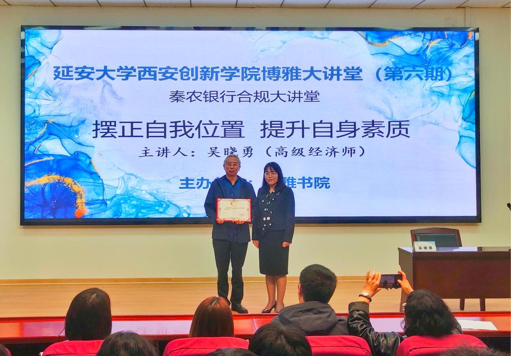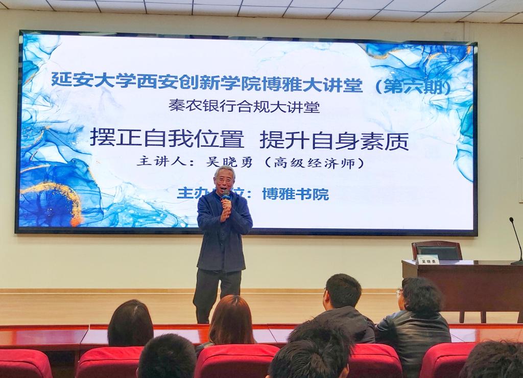 本网讯 10月30日,博雅书院联合秦农银行在樊川大讲堂举办公司第六期博雅大讲堂——“老员工职业素质提升”主题报告会。秦农银行合规管理部总经理、高级经济师吴晓勇受邀担任主讲人。秦农银行合规管理部职员、云顶国际8588yd教师及190余名书院员工聆听报告。报告会由书院副经理张洋阳主持。