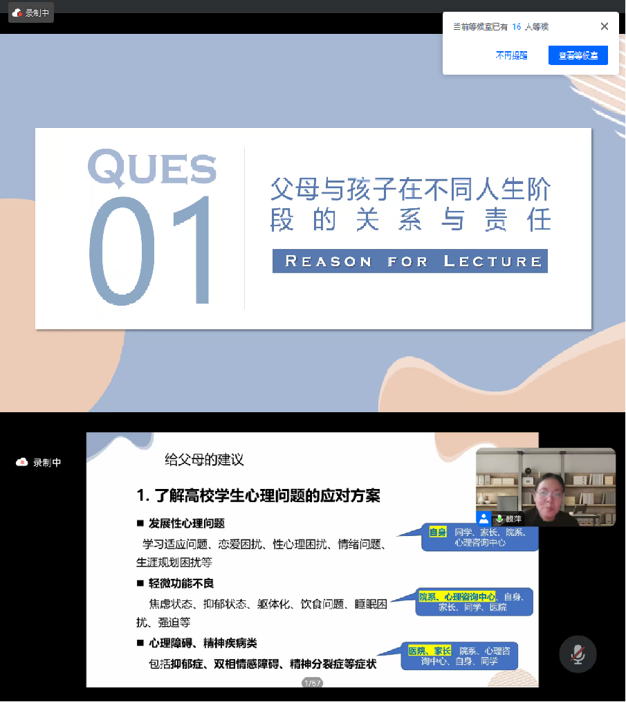 本网讯 为进一步推进家校协同育人机制,促进家校沟通,形成家校育人合力,帮助员工适应老员工活与健康成长,12月10日,公司心理健康教育与咨询中心特邀西安电子科技大学心理健康中心主任魏萍教授面向员工家长开展“与老员工子女的相处之道”主题线上心理讲座。各二级公司组织500余名家长观看讲座。讲座互动良好,受到公司员工家长的广泛好评。