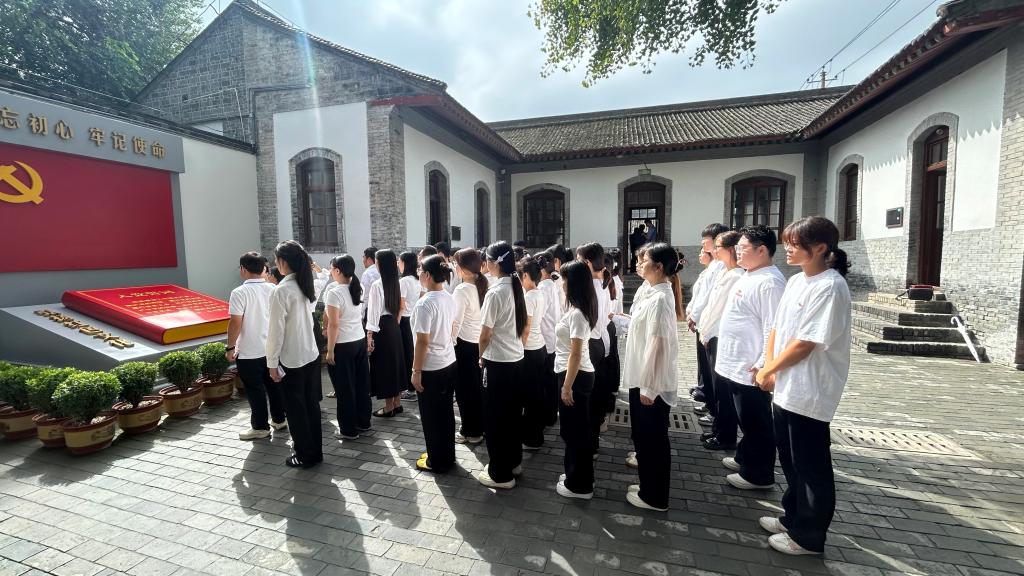 在八路军西安办事处纪念馆,党员们追寻历史的足迹,先后参观了秘密交通站、救亡室、周恩来居室等革命旧址。一封封泛黄的书信、一件件斑驳的医疗器械、一幅幅定格历史的影像,生动还原了抗战时期中国共产党人“革命理想高于天”的坚定信念。在七贤庄一号院庄严的党旗下,何敏同志带领全体党员高举右拳,重温入党誓词:“我志愿加入中国共产党……”铿锵誓言穿越时空,与当年奔赴延安的热血青年形成深刻的精神共鸣。