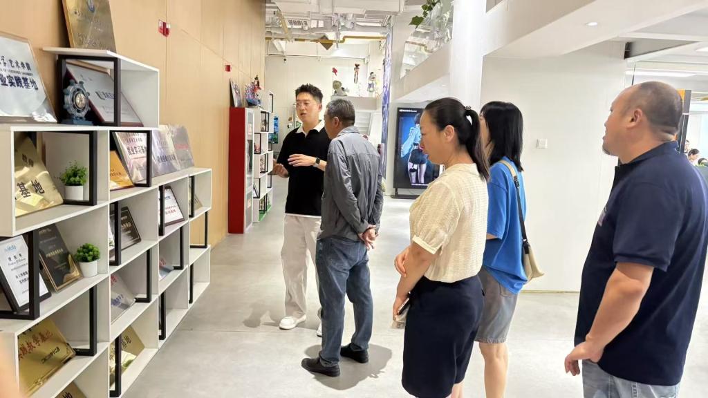在企业负责人陪同下,赵雪伟一行实地参观了灵机互动办公区、项目成果展示中心及技术研发部门,近距离了解了企业项目流程、设计方案落地过程及前沿技术应用。参观教师对环境设计行业的实战需求有了更直观的认识,并围绕空间设计的创新性与落地性、数字技术与传统设计的融合等问题与企业设计师进行了深入探讨。