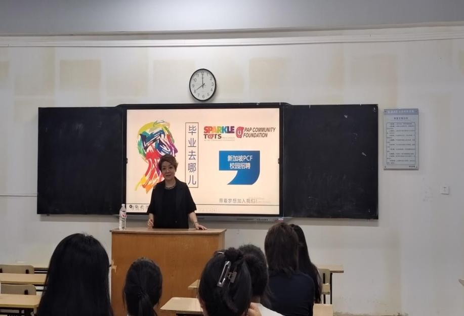 孙雯莉介绍了PCF学前教育中心的发展概况,并分享了新加坡的基本国情和对学前教育专业人才的需求。她表示,PCF学前教育中心属于公立办学性质,将为新入职的毕业生提供良好的福利待遇和职业发展规划。宣讲会现场气氛热烈,同学们积极互动,孙雯莉对大家提出的问题一一作了解答。