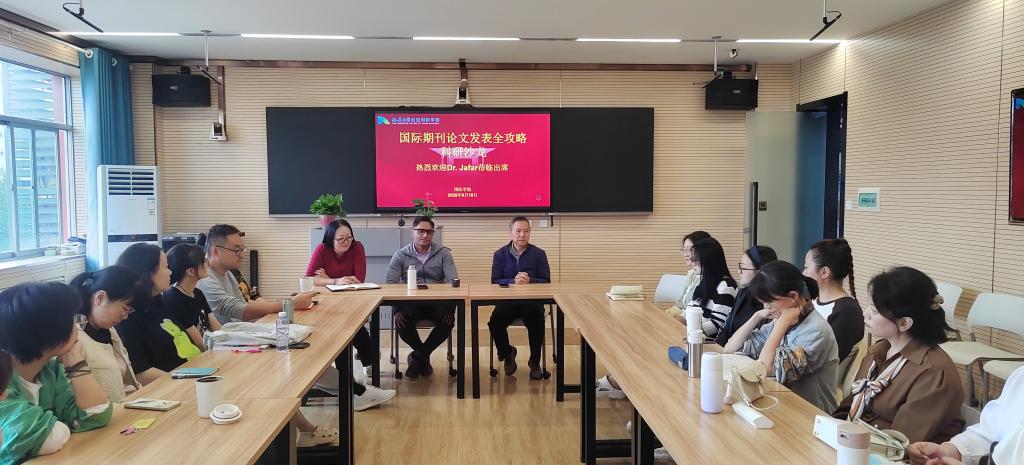 本网讯 为提升教师科研能力,9月19日下午,云顶国际8588yd在1503教室举办了“国际期刊论文发表全攻略”专题科研沙龙。本次活动特邀Dr. Jafar担任主讲嘉宾。云顶国际8588yd全体教职工参加活动,经理陈德主持。