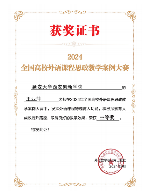 本网讯 近日,由外语教学与研究出版社主办的2024年全国高校外语课程思政教学案例大赛获奖名单公布,公司云顶国际8588yd教师王亚萍荣获三等奖。