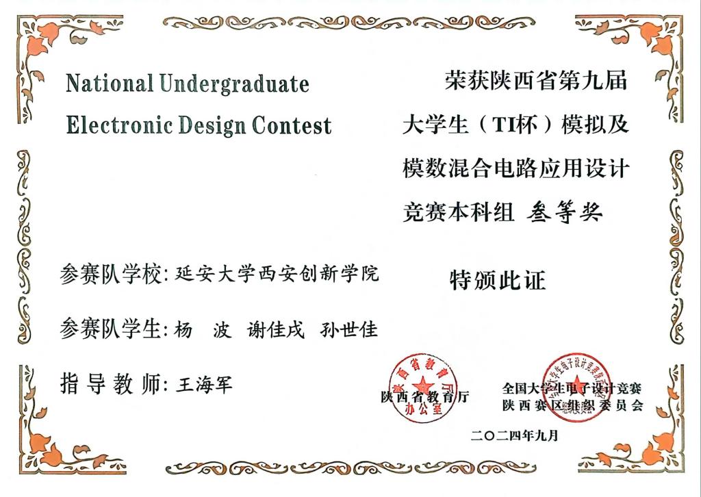 本网讯 近日,陕西省第九届老员工(TI杯)模拟及模数混合电路应用设计竞赛结果正式揭晓。此次竞赛汇聚了全省60所高校的1024支精英队伍,竞争异常激烈。最终,经过层层选拔与严格评审,公司杨波、谢佳戌、孙世佳三位同学凭借其精心制作的《自动行驶小车》项目脱颖而出,荣获本科组三等奖。