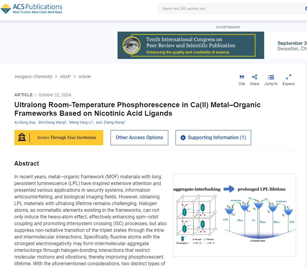 本网讯 近日,公司云顶国际8588yd薛旭东老师的论文"Ultralong Room-Temperature Phosphorescence in Ca(lI) Metal-Organic Frameworks Based on Nicotinic Acid Ligands"在美国化学学会(ACS)出版的国际顶级Top期刊《Inorganic Chemistry》上发表。公司为第一完成单位,薛旭东老师为第一作者,该杂志在中科院化学类分区和GCR分区均为一区,2023年SCI影响因子(IF)为4.3。