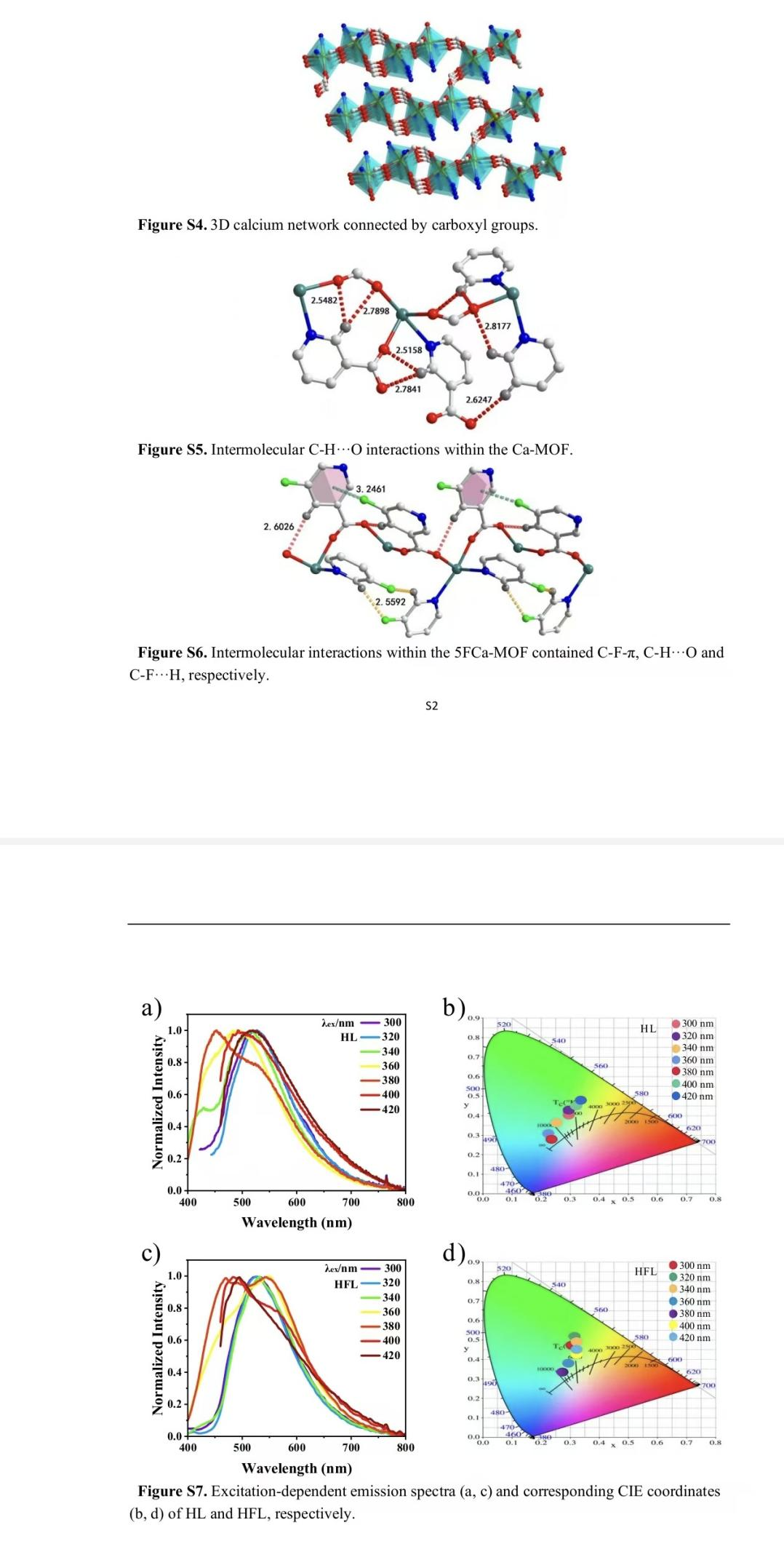 金属有机骨架(MOF)材料引起了广泛关注,并在药物分离科学领域,安防系统、信息防伪和生物成像领域呈现出多种应用。获得具有超长寿命的化学发光材料仍然具有挑战性。卤素原子作为存在于框架中的非金属元素,不仅可以诱导重原子效应,有效地增强自旋-轨道耦合和促进系统间交叉(ISC)过程,而且可以通过分子内和分子间的相互作用抑制三重态的非辐射跃迁。具体来说,电负性最强的氟原子可以通过卤素键作用形成分子间聚集体互锁,限制分子的运动和振动,从而提高磷光寿命。基于上述考虑,本工作中合成了两种不同类型的含/不含氟原子的MOF(即Ca-MOF和5FCa-MOF)。