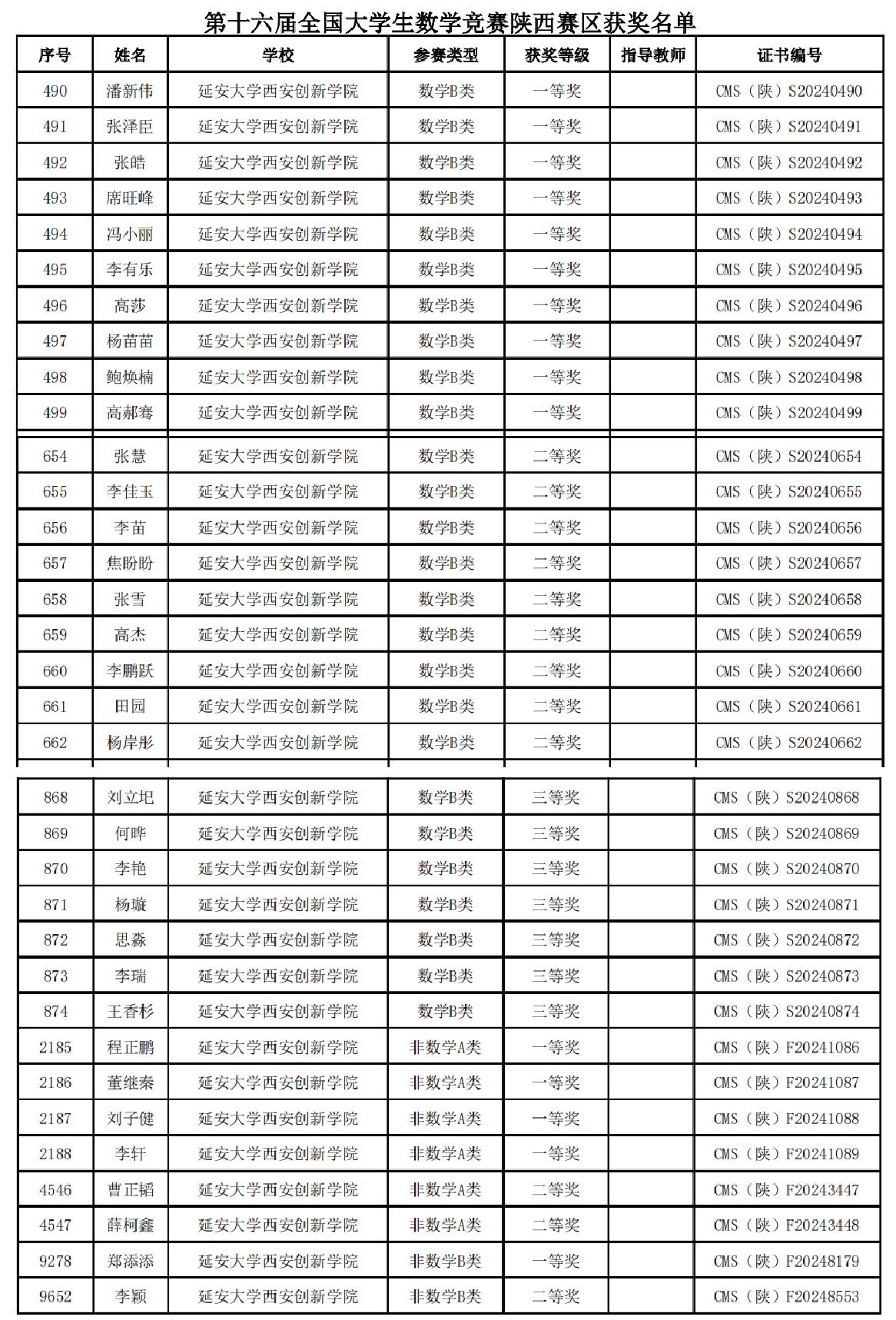 陕西省级奖项名单(部分)