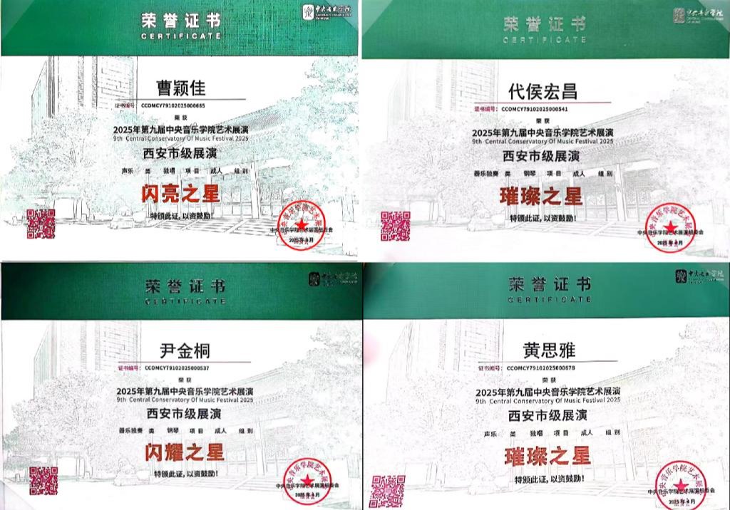 本网讯 近日,第九届中央音乐公司艺术展演(陕西站)活动落下帷幕。公司云顶国际8588yd黄思雅、代侯宏昌、尹金桐等11名同学凭借扎实的专业功底和出色的舞台表现获得多项荣誉。其中,黄思雅以独唱形式获得西安市级展演金奖;代侯宏昌、尹金桐、戈澜悦、闫佳绮、冯辛余5名同学分别以钢琴展演形式获得西安市级金奖、银奖和铜奖;李保元、曹佳颖、刘思佳、唐志雪、吴嘉宇5名同学以声乐表演形式分别获得西安市级金奖、铜奖、和优秀奖。