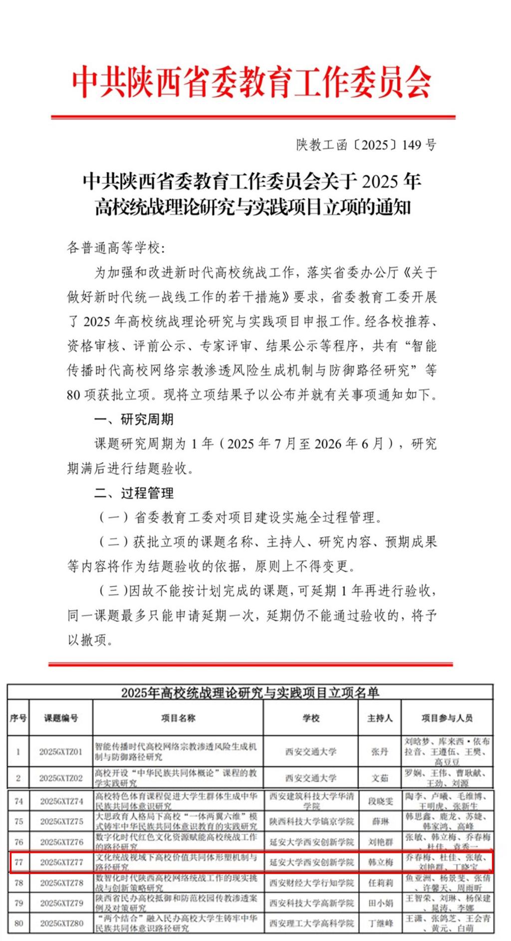 本网讯 近日,中共陕西省委教育工作委员会公布2025年高校统战理论研究与实践项目立项名单。经各校推荐、资格审核、评审前公示、专家评审、结果公示等程序,公司由刘艳群副教授主持的《数字化时代红色文化资源赋能高校统战工作的路径研究》、韩立梅副教授主持的《文化统战视域下高校价值共同体形塑机制与路径研究》获准立项,这是公司建校以来首次获批省级统战理论研究与实践类项目。