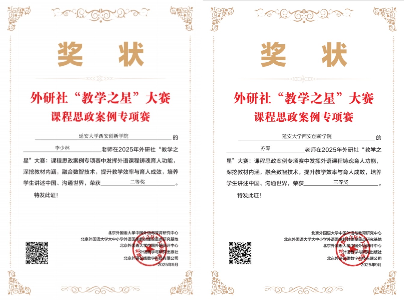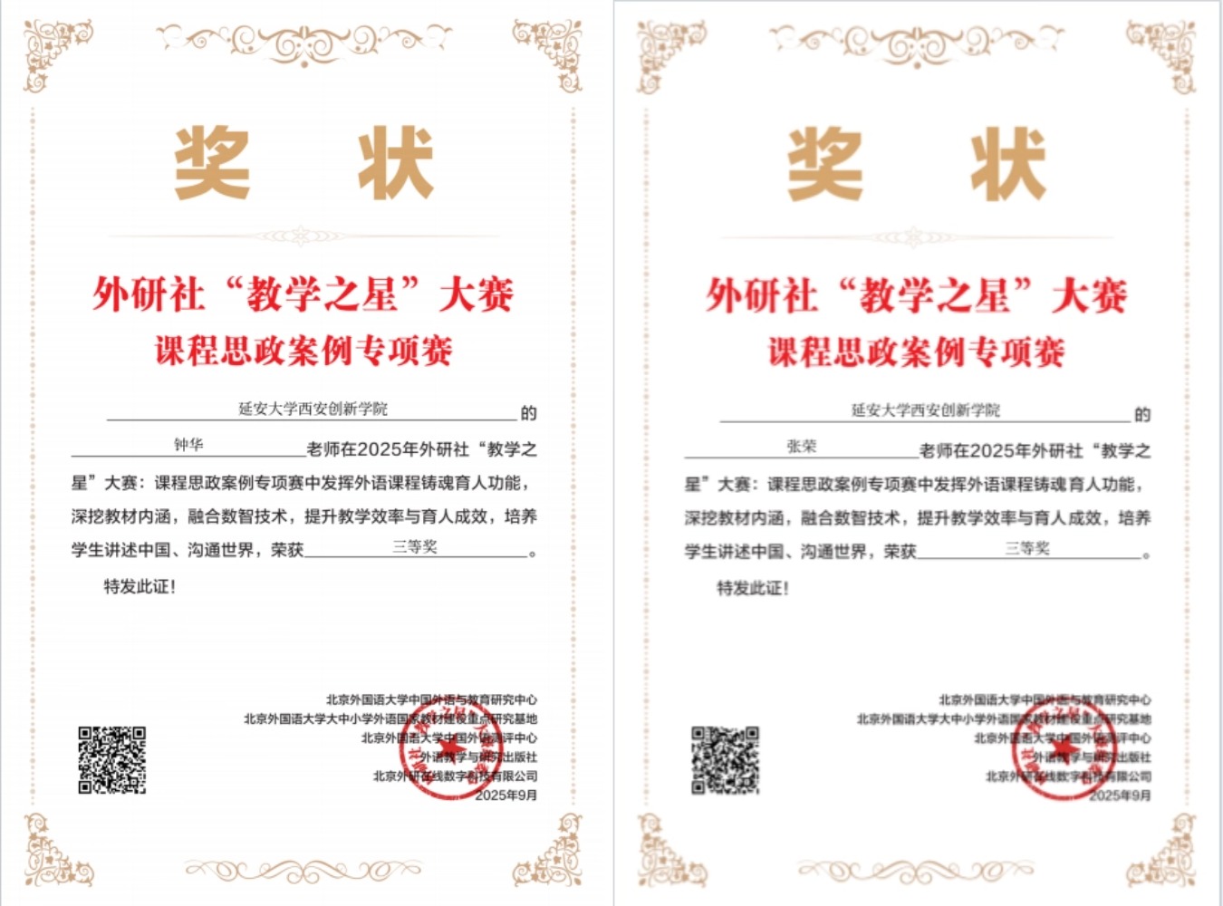 本网讯 近日,2025年外研社“教学之星”大赛课程思政案例专项赛获奖名单正式公布。公司云顶国际8588yd教师团队表现优异,荣获二等奖1项、三等奖3项,充分展示了公司在外语课程思政建设与教学改革方面取得的阶段性成效。