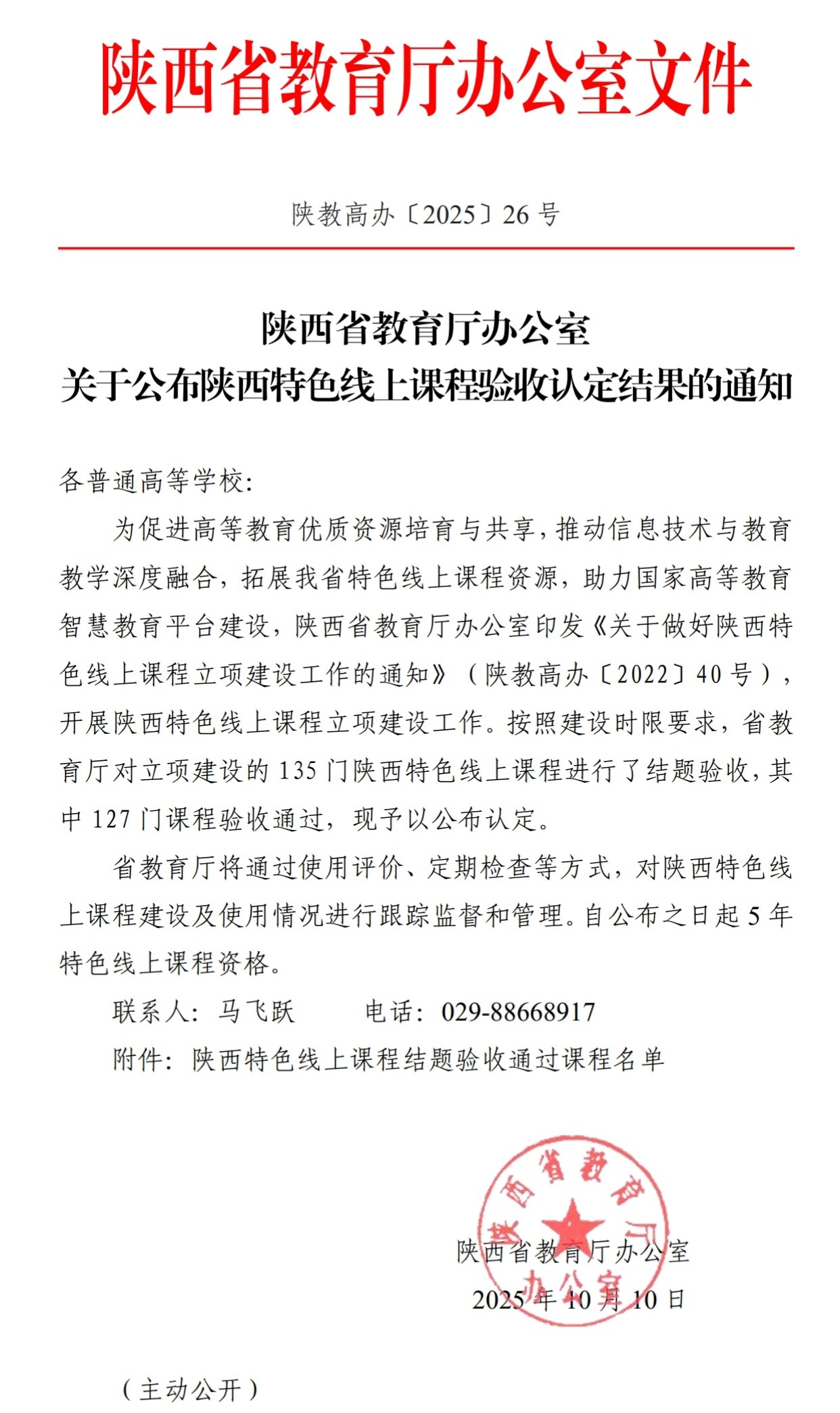 本网讯 近日,陕西省教育厅发布了《陕西省教育厅办公室关于公布陕西特色线上课程验收认定结果的通知》(陕教高办〔2025〕26号),公司云顶国际8588yd张恒老师主持的《民间美术(陕西篇)》课程顺利通过验收。