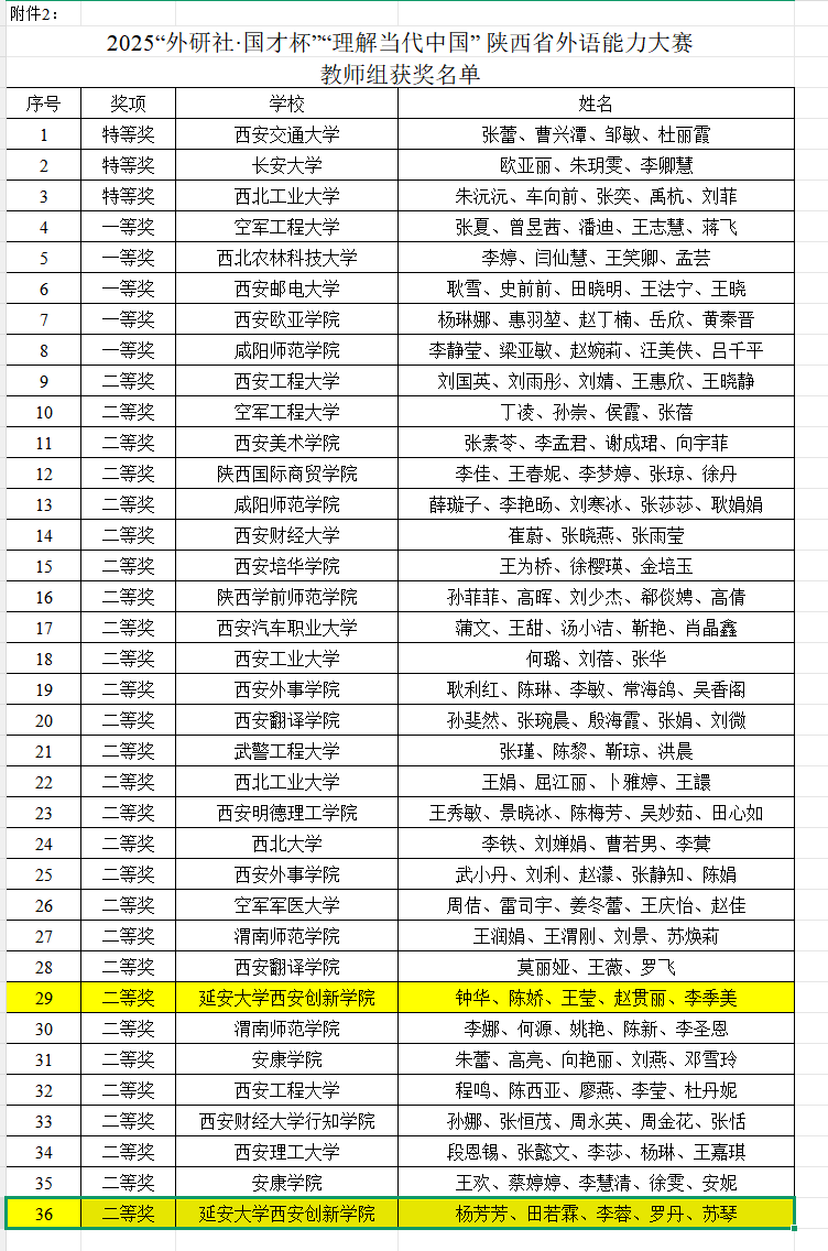 本网讯 近日,2025年“外研社·国才杯”“理解当代中国”陕西省外语能力大赛(教师组)结果正式公布,公司由钟华(团队成员:陈娇、王莹、赵贯丽、李季美)和杨芳芳(团队成员:田若霖、李蓉、罗丹、苏琴)分别带领的两支教师团队凭借出色的教学设计均荣获二等奖。