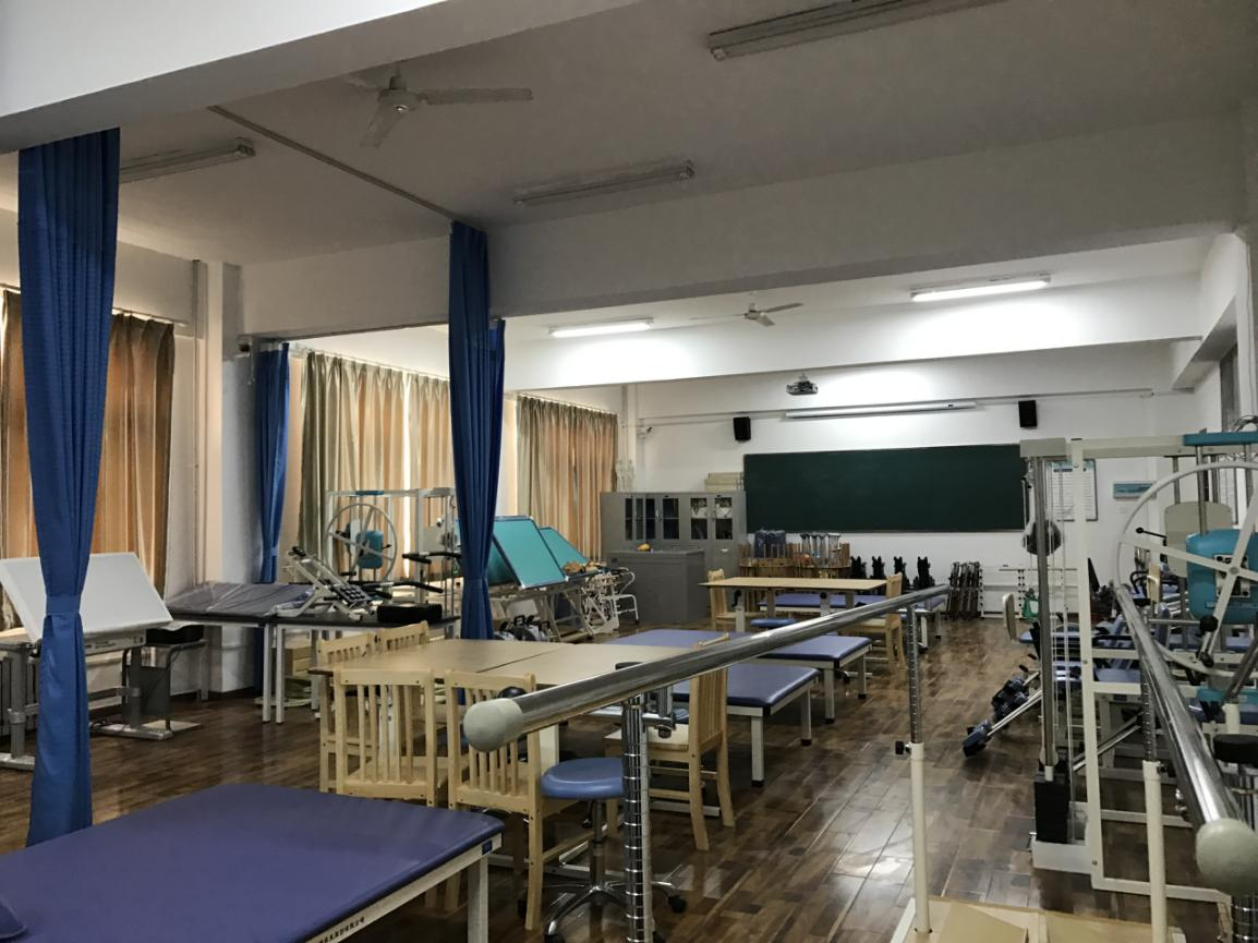 康复专业实训室主要分为三个模块:运动、言语、作业疗法区,配有多功能训练器、平行杠(配矫正板)、训练用楼梯、上肢推举训练器、髋关节训练器、踝关节训练器、电动直立床、功率车、平衡板、磨砂板及各中助行器等大、中型运动治疗设备。空气波压力治疗仪、短波治疗仪、生物反馈治疗仪、吞咽功能障碍治疗仪等物理治疗设备。